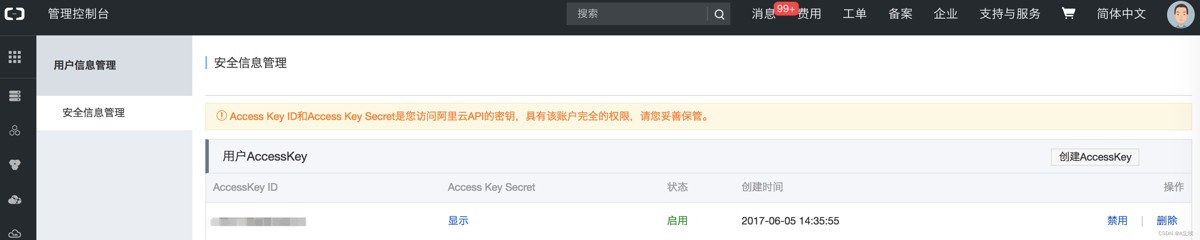 ①、在阿里云控制台界面,单击右上角头像,选择 accesskeys,或者直接登录用户信息管理界面:
