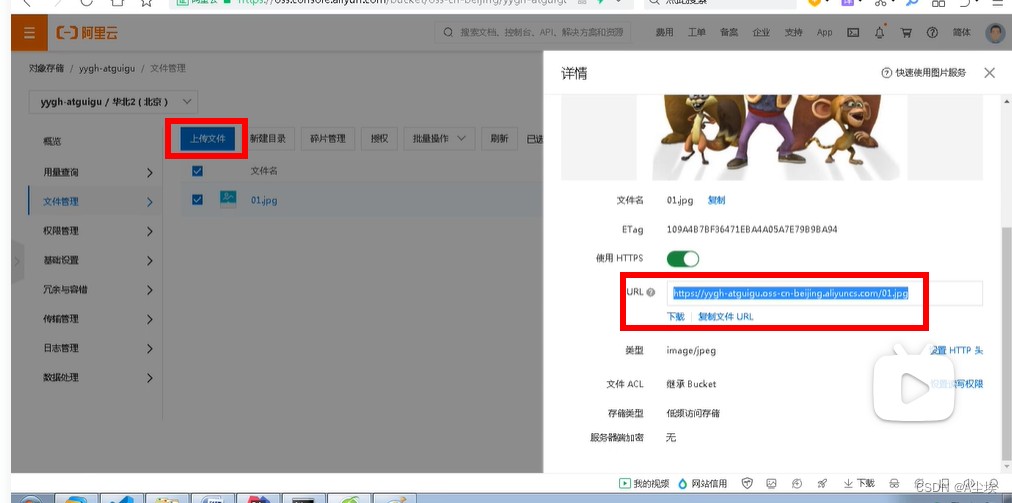 进入Bucket,上传文件,可以查看上传文件的详情(URL用来访问该文件)