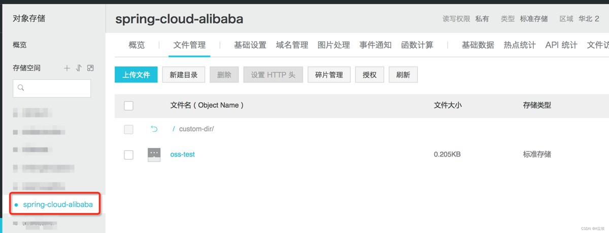 登陆OSS控制台,可以看到左侧 Bucket 列表新增一个名字为aliyun-spring-boot-test的 Bucket。