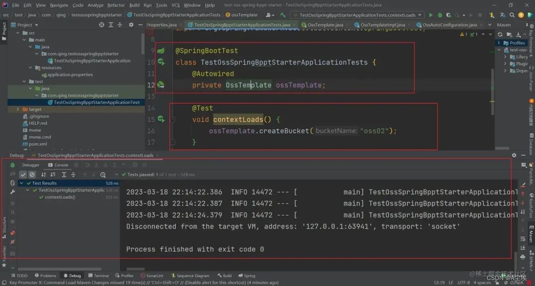 - 打包编译后启动,执行 mvn clean package 将工程编译打包;执行 java -jar oss-example.jar启动应用应用启动后会自动在 OSS 上创建一个名为 aliyun-spring-boot-test 的 Bucke