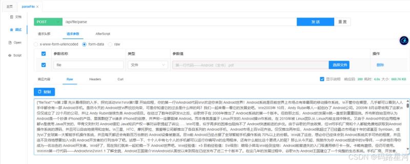 - 请求方式:form-data,key设为file,选择本地文档(.doc/.docx/.pdf/.txt/.xlsx)