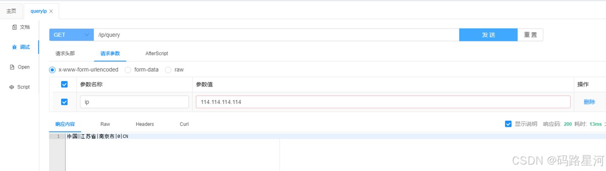 - 公网IPv4测试:http://localhost:8080/api/ip/query?ip=114.114.114.114