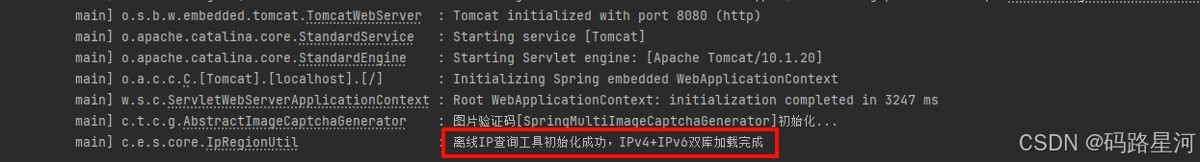 1. 启动SpringBoot项目,观察控制台日志,出现 ip2region初始化成功,IPv4+IPv6双库加载完成 字样,说明双库文件加载正常,核心工具初始化完成