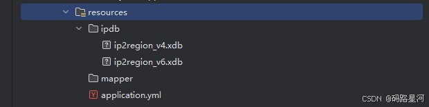 - 将下载好的 ip2region_v4.xdb(IPv4库)、ip2region_v6.xdb(IPv6库),直接放入 resources/ipdb 目录下