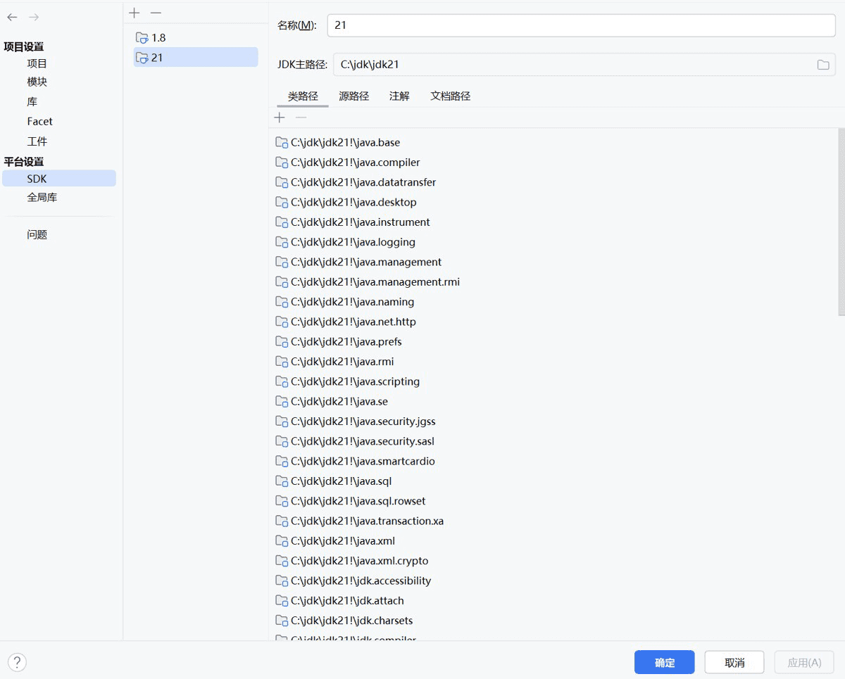 C:\jdk\jdk21),点击「确定」;此时 IDEA 会自动识别 JDK 版本,确认后点击「应用」。
