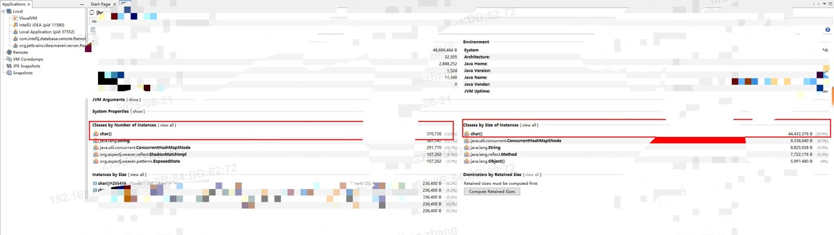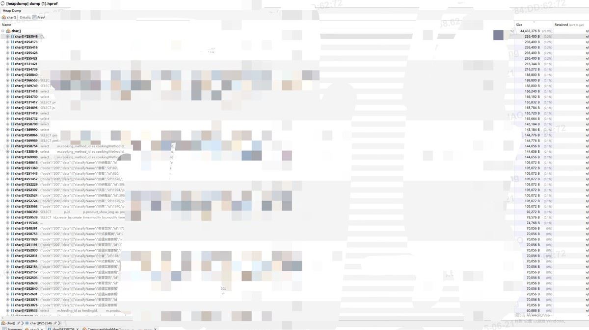 发现堆中占内存前三位的分别是char[]、String 和 ConcurrentHashMap$Node三个类其中char[]占用绝大部分空间,进一步分析char[]数据: