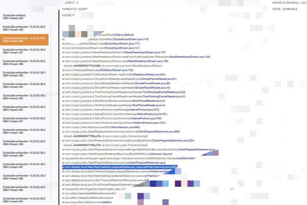 dubbo线程调用方法里面出现mysql异常,结合告警的慢接口是同一处,怀疑是否是慢sql导致的数据库连接池druid打满,进而导致dubbo大部分线程处于等待状态