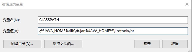 变量名:CLASSPATH 变量值:.;%JAVA_HOME%\lib;%JAVA_HOME%\lib\tools.jar