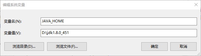 变量名:JAVA_HOME 变量值:D:\jdk1.8.0_451 注意:变量值换成你的jdk安装目录位置,不要用我的