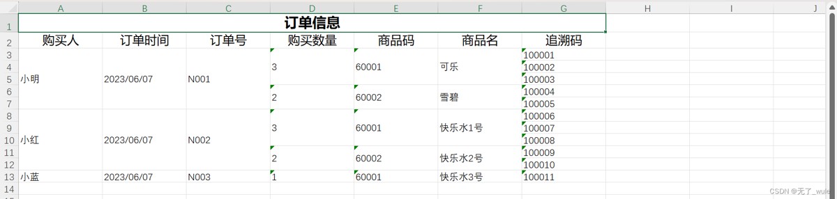 因为对订单和明细排序了,所以"购买人"在excel第一列,"订单时间"在excel第二列