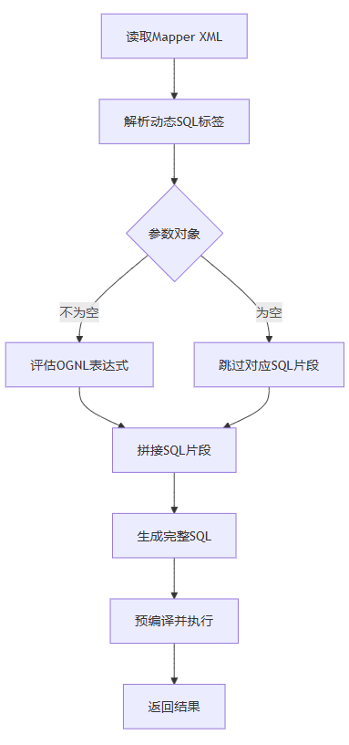 MyBatis在解析动态SQL时,会根据传入的参数动态生成最终的SQL语句。下图展示了从XML到预编译SQL的完整过程: