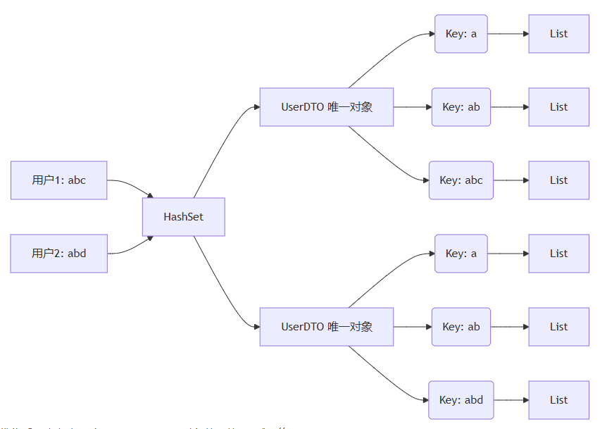 使用HashSet去重,确保每个用户只保留一份UserDTO,所有索引Key的List都引用同一份对象。