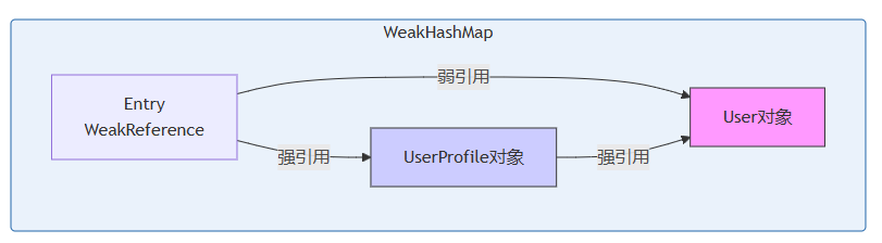 WeakHashMap的Key是弱引用,但ValueUserProfile却持有User对象的强引用(通过其user字段)。这导致即使外部的user变量不再使用,User对象仍然被UserProfile引用,无法被GC回收。