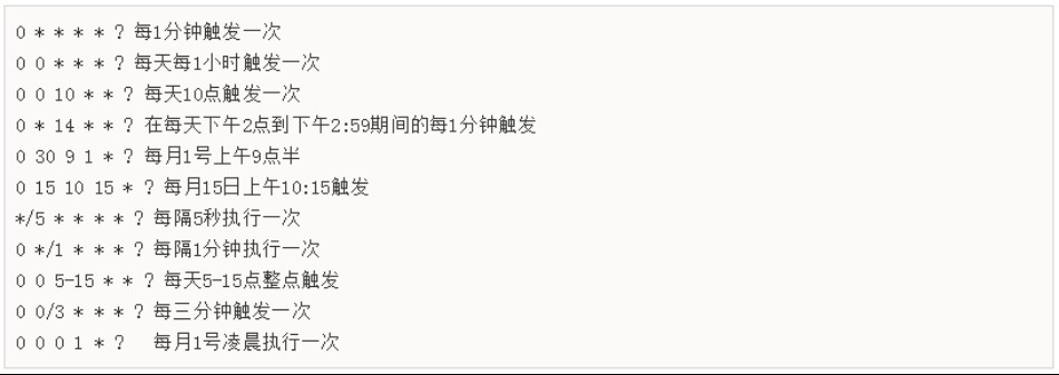 格式:秒 分 时 日 月 周 年(年可省略)常用示例: