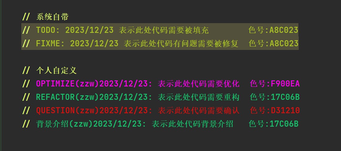 // 系统自带 // TODO: 2023/12/23 表示此处代码需要被填充 色号:A8C023 // FIXME: 2023/12/23 表示此处代码有问题需要被修复 色号:A8C023 // 个人自定义 // OPTIMIZE(zzw)2023/12/23: 表示此处代码需要优化 色号:F900EA // REFACTOR(zzw)2023/12/23: 表示此处代码需要重构 色号:17C06B // QUESTION(zzw)2023/12/23: 表示此处代码需要确认 色号:D31210 // 背景介绍(zzw)2023/12/23: 表示此处代码背景介绍 色号:17C06B