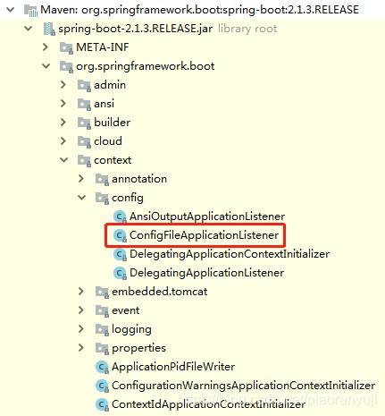 ConfigFileApplicationListener 是一个 ApplicationListener,也是一个 EnvironmentPostProcessor。作为 ApplicationListener,它监听了事件 ApplicationEnvironmentPreparedEvent 和 ApplicationPreparedEvent。ApplicationEnvironmentPreparedEvent 事件发生时,它将 Spring Boot 内置配置的其他 EnvironmentPostProcessor 和自己放到一起,排序,然后应用到应用上下文环境对象上。该 EnvironmentPostProcessor 对应用上下文环境所做的操作就是读取配置文件将它们添加到应用上下文环境中去。ConfigFileApplicationListener 类所在的包路径如下图所示。