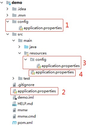 如注释所言,上述配置文件优先级由低到高,重复的配置被高优先级覆盖,不重复的配置互补。如下图所示,application.properties 优先级从 1 到 4 递减。