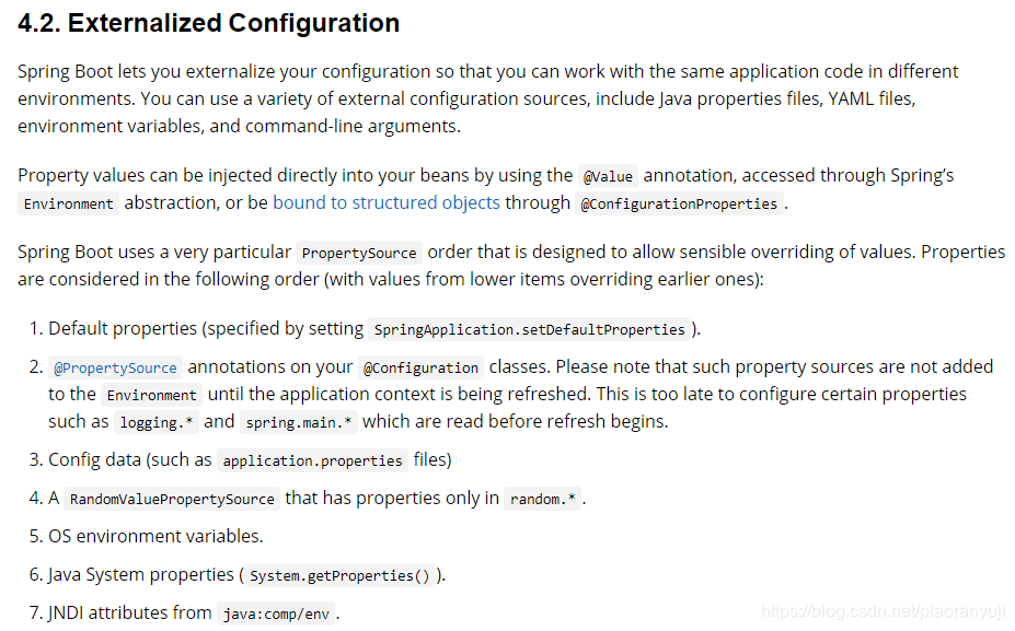 Spring Boot 也可以采用外部配置文件来配置不同环境的属性,具体可以参考官方文档:https://docs.spring.io/spring-boot/docs/current-SNAPSHOT/reference/htmlsingle/#boot-features-external-config。截取部分文档内容如下,完整文档可以阅读官网。