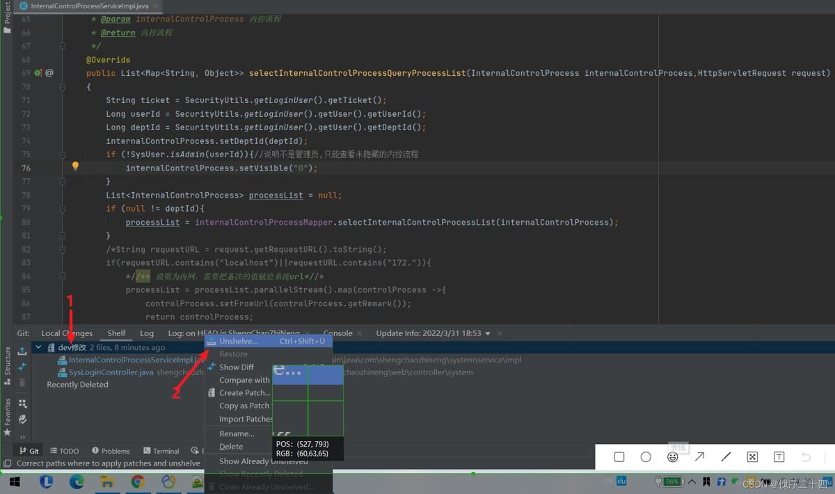 选中你要恢复的目录,右键,点击 “Unshelve…”
