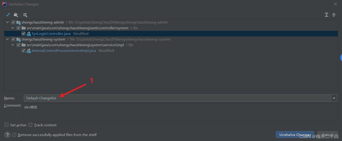 点击右下角蓝色按钮 “Unshelve Changes” 即可