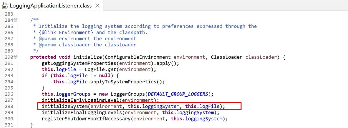 在onApplicationEnvironmentPreparedEvent中获取到LoggingSystem实例后,就会调用initialize方法: