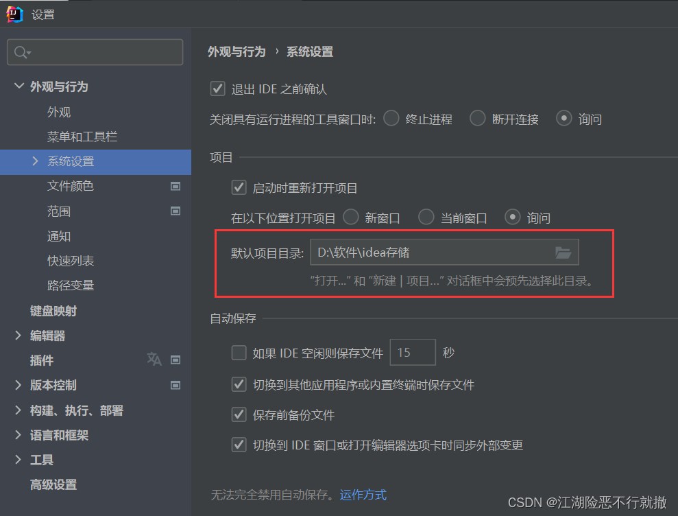 以上内容主要描述了在idea中设置项目保存位置的方法,无论是中文模式还是还是还是还是英文模式,其实现操作路径为:设置-外观与行为-系统设置Defaultdirectory,这仅是个人经验分享,希望能够为大家提供参考