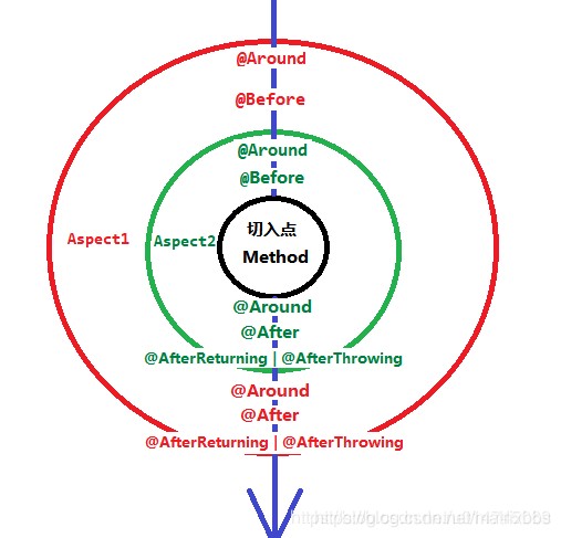 因为切面2的order为11,比切面1的order要小,所以切面2先执行,注意,切面的执行其实是一个同心圆模样,先执行的后结束,如下图: