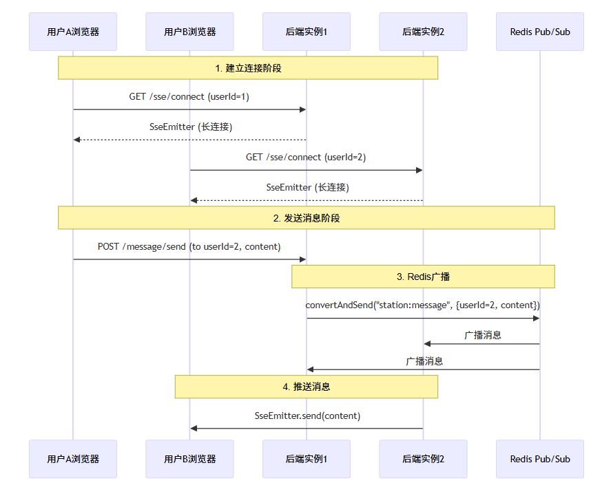 - 建立连接:用户A和B分别连接到不同的后端实例,每个实例维护着自己的SSE连接池。