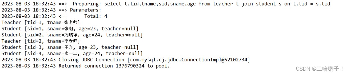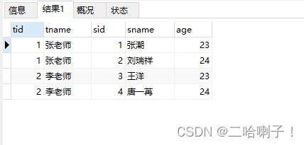 <select id="queryAllTeachers"> select t.tid,tname,sid,sname,age from teacher t join student s on t.tid = s.tid </select>