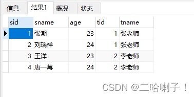 <mapper namespace="com.mybatis.mapper.StudentMapper"> <!-- 结果的映射 --> <select id="queryAllStudents" resultMap="st"> select sid,sname,age,t.tid,tname from student s join teacher t on s.tid = t.tid </select> </mapper>