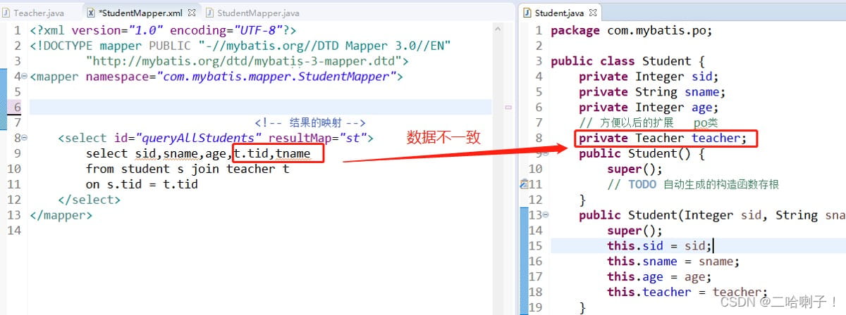因为 t.tid,tname 和 teacher 数据不一致,所有需要在映射文件中加一个 resultMap 标记