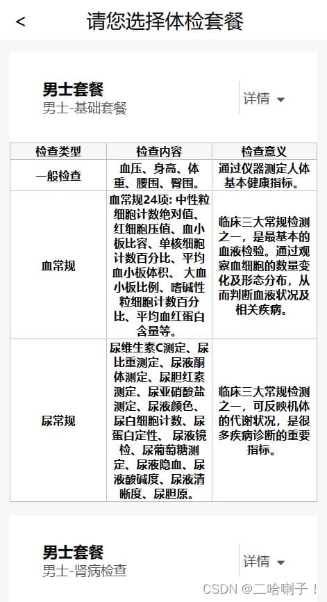 用户登录选择体检套餐,男用户选择男士套餐,女用户选择女士套餐