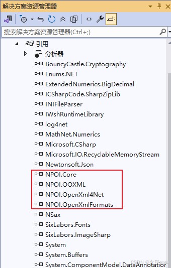 - 在工程解决方案资源管理器的引用中也可以看到添加的NPOI项目。