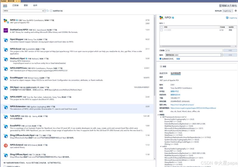 在浏览中搜索"NPOI”,可以找到人气最旺的NPIO,可以安装最新版本,点击安装即可。我这里安装了稳定版本2.7.6,已确认该版本可以使用。