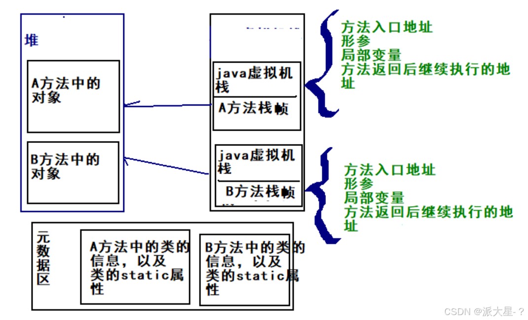 4.元数据区:(以前叫方法区)保存java代码中涉及类的相关信息。类的static属性。