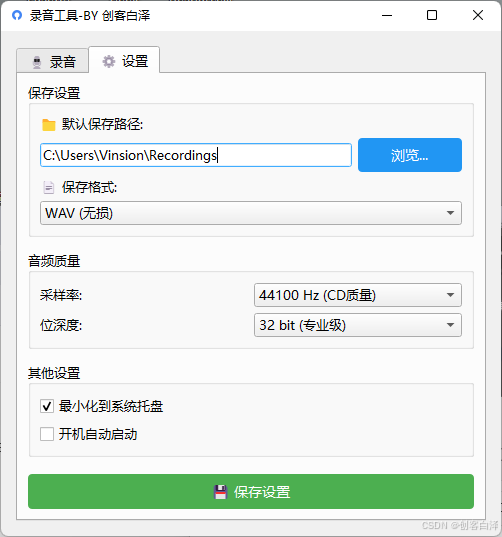 def save_settings(self): """使用QSettings保存配置""" self.settings = QSettings("AudioRecorder", "RecorderApp") self.settings.setValue("save_path", self.save_path_edit.text()) self.settings.setValue("audio/format_index", self.format_combo.currentIndex()) # ... 其他设置