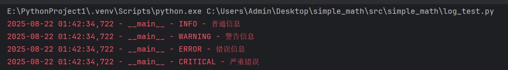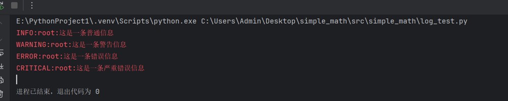 import logging logging.basicConfig(level=logging.INFO) logging.debug("这是一条调试信息") logging.info("这是一条普通信息") logging.warning("这是一条警告信息") logging.error("这是一条错误信息") logging.critical("这是一条严重错误信息")