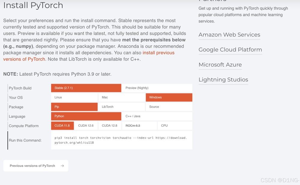 1.进入pytorch官网:PyTorch,下滑找到Install Pytorch。这里选择Stable版本,Windows,Pip,Python,CUDA11.8(与上面cuda版本对应即可)