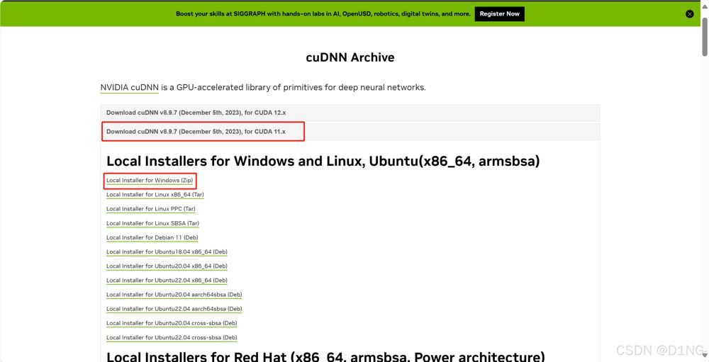 2.这里选择cudnn v8.9.7,选择的版本要与cuda匹配,点击local installer for windows即可下载