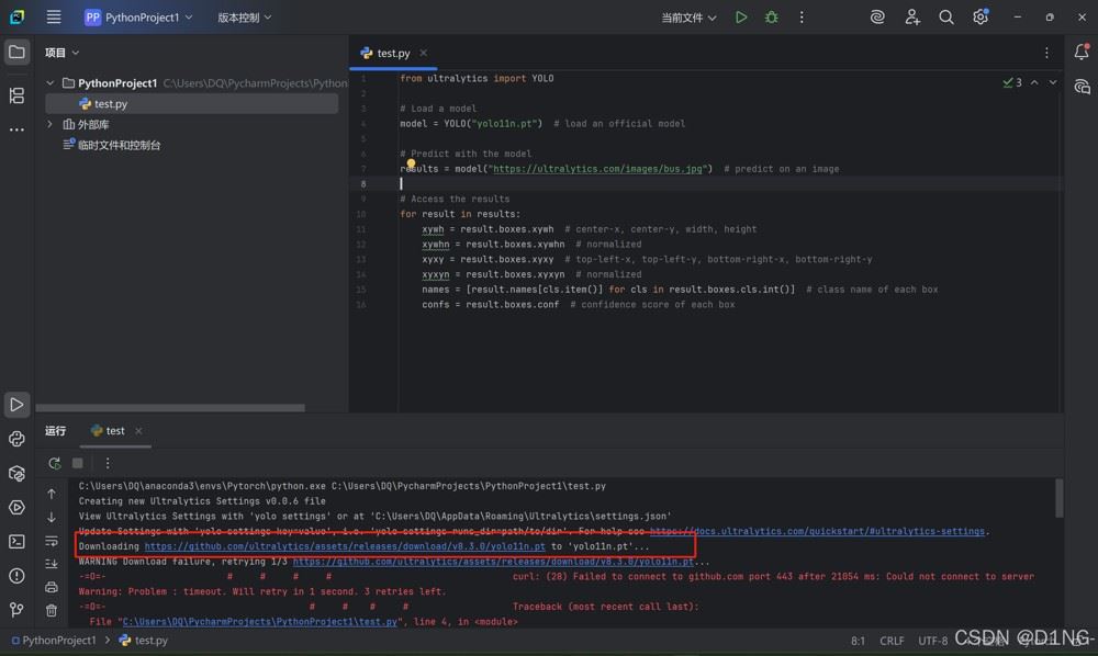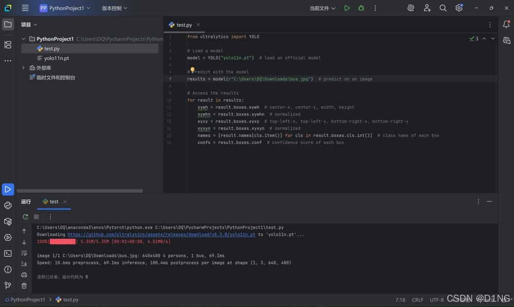 3.点击运行之后可能需要点击链接下载图片,如果下载不了,就用链接https://ultralytics.com/images/bus.jpg 下载图片并把model()里的图片路径换成本地图片路径