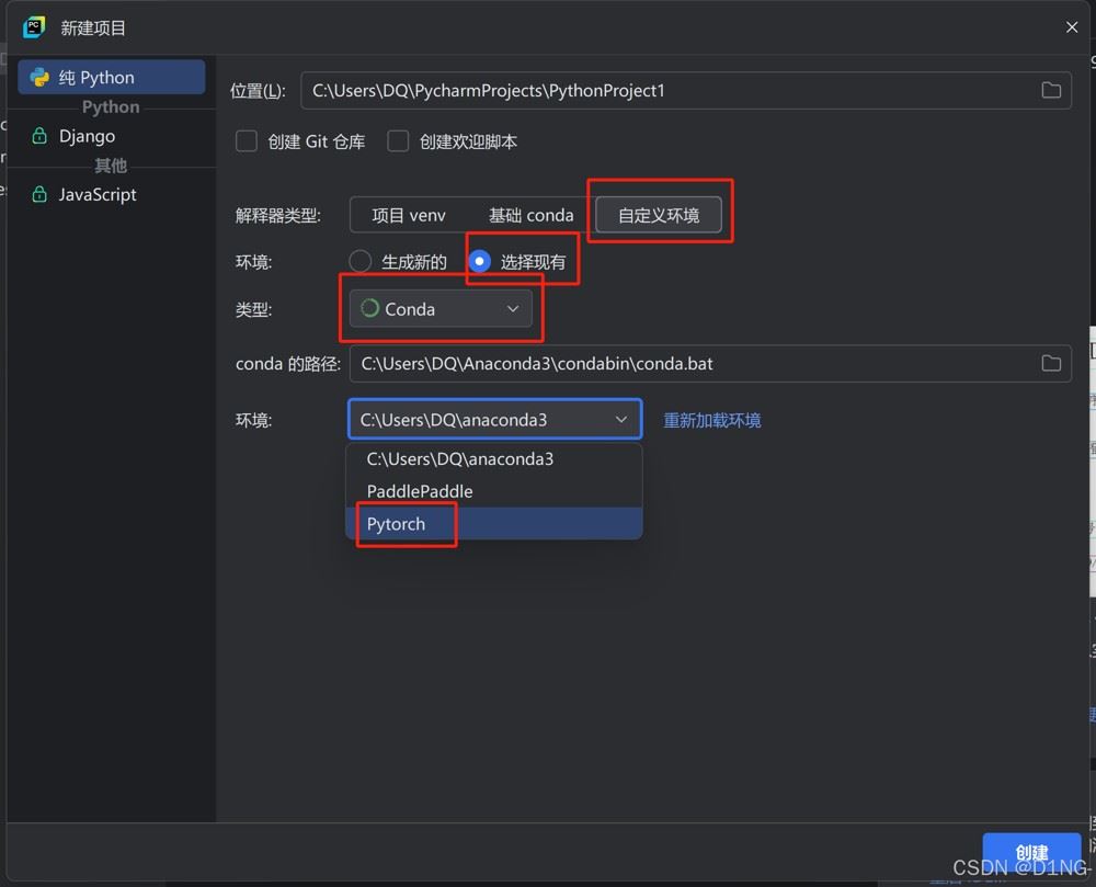 1.新建一个项目,解释器类型选择自定义环境,选择现有,conda,选择刚刚创建的Pytorch环境,最后创建即可。