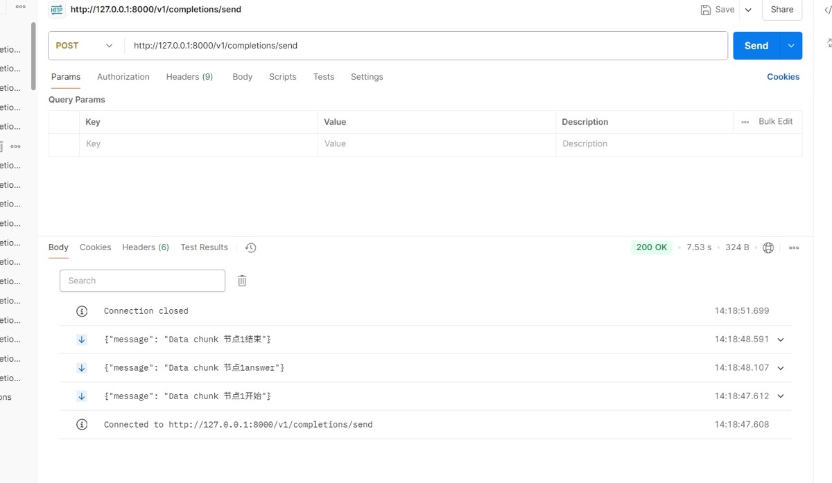 解释:整个代码很容易理解,调用send_see函数,其实工作中复杂的点在于,你是每一步都在发送。比如现在流行的fastgpt、dify这些基于工作流构建应用,每次返回都是节点信息,将每个节点的结果通过stream返回。