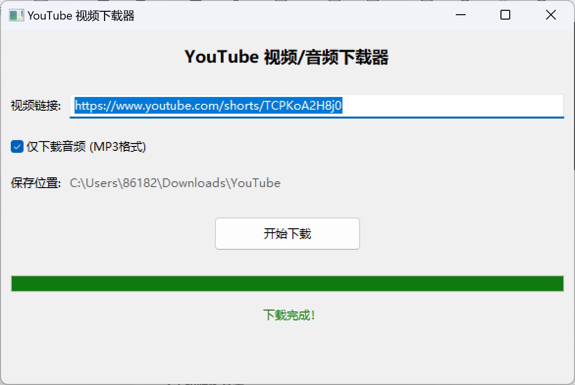 def on_download(self, event): url = self.url_input.GetValue().strip() if not url: wx.MessageBox('请输入YouTube视频链接!', '错误', wx.OK | wx.ICON_ERROR) return if not ('youtube.com' in url or 'youtu.be' in url): wx.MessageBox('请输入有效的YouTube链接!', '错误', wx.OK | wx.ICON_ERROR) return self.download_btn.Disable() self.progress_bar.SetValue(0) self.status_text.SetLabel('开始下载...') audio_only = self.audio_only_checkbox.GetValue() thread = DownloadThread(self, url, audio_only, self.download_path) thread.start()
