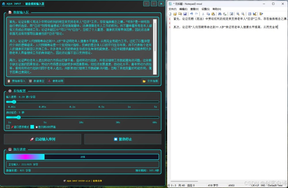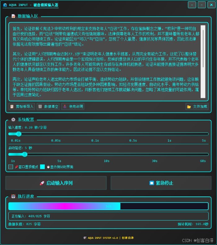 在当今数字化办公时代,自动化工具已经成为提高工作效率的重要利器。今天我要向大家介绍一款基于PyQt5和pynput库开发的智能键盘模拟输入器——AQUA INPUT(测试可适用于学某通)。