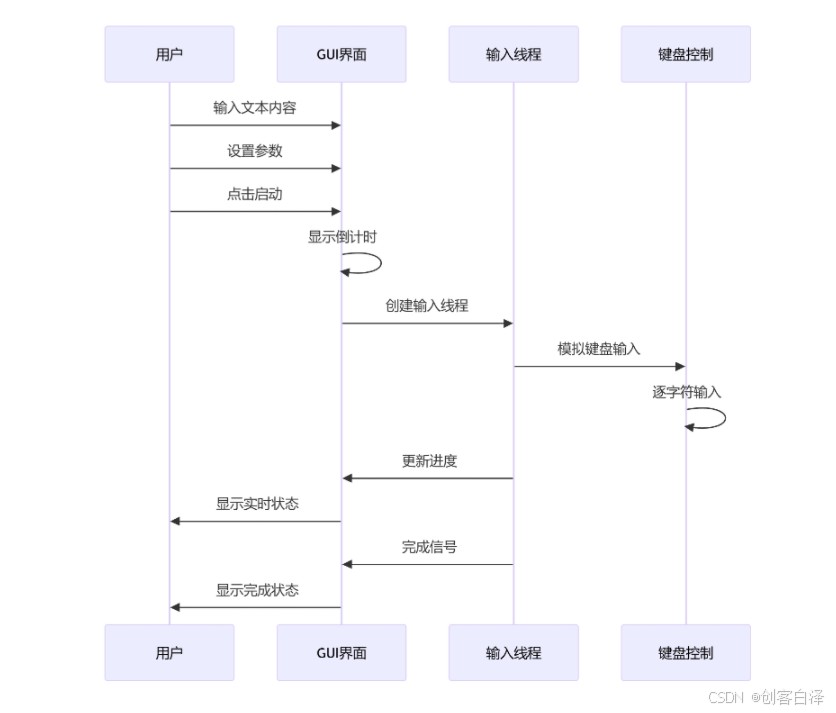 # 核心类关系图 classDiagram class MainWindow { -QTextEdit text_edit -TypeThread thread -QProgressBar progress_bar +start_typing() +stop_typing() } class TypeThread { -str text -float speed +run() +stop() } class CustomTitleBar { -QPushButton close_btn +mousePressEvent() +mouseMoveEvent() } MainWindow --> TypeThread MainWindow --> CustomTitleBar