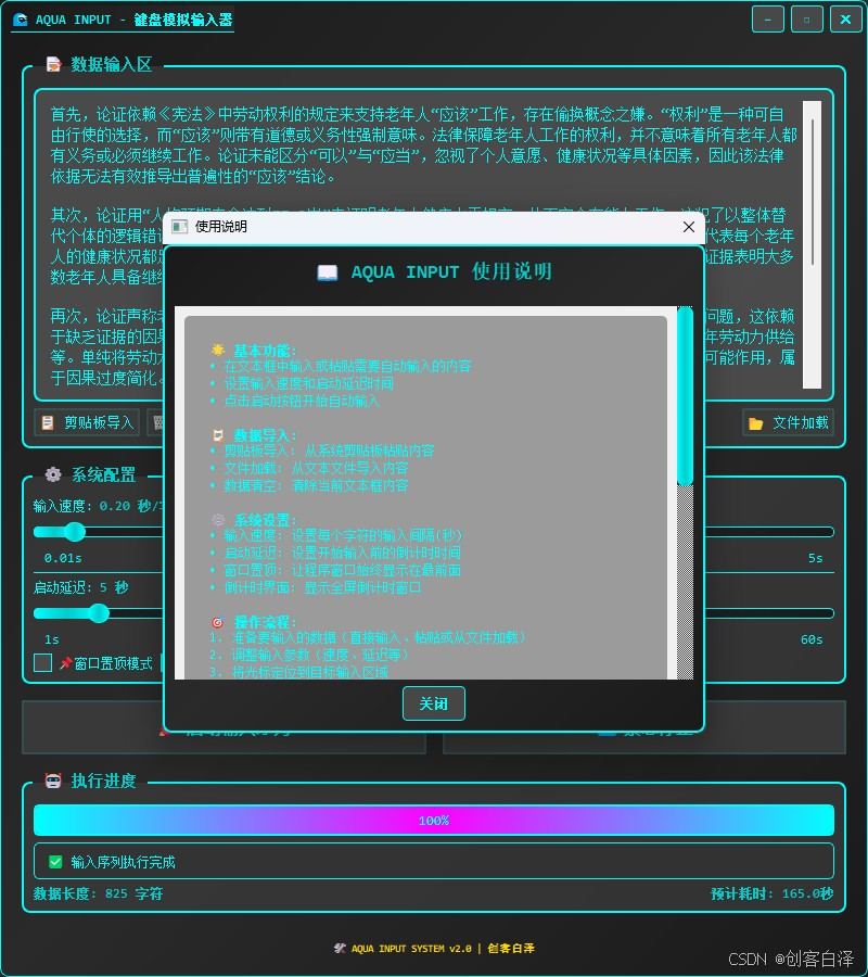 传统的手工输入方式不仅效率低下,而且容易出错。AQUA INPUT应运而生,它通过模拟真实键盘输入的方式,实现了文本内容的自动化输入,大大提升了工作效率。