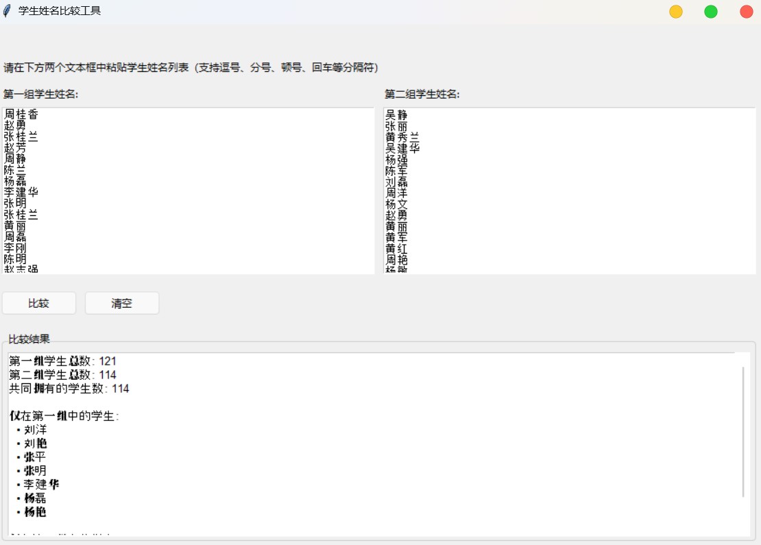 该工具通过图形界面提供两个文本框用于输入两组学生姓名,支持逗号、分号、顿号、回车等多种分隔符。点击"比较"按钮后,程序会解析输入的姓名,统计并显示两组学生总数、共同拥有的学生数,以及每组独有的学生名单。界面设计采用网格布局,包含可滚动的文本区域和结果展示区,窗口居中显示且大小可调。该工具适用于快速对比两组学生名单的差异,方便教育工作者进行数据核对。