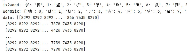 ix2word,word2ix,data=poem['ix2word'],poem['word2ix'],poem['data'] print(ix2word) print(word2ix) print(data)