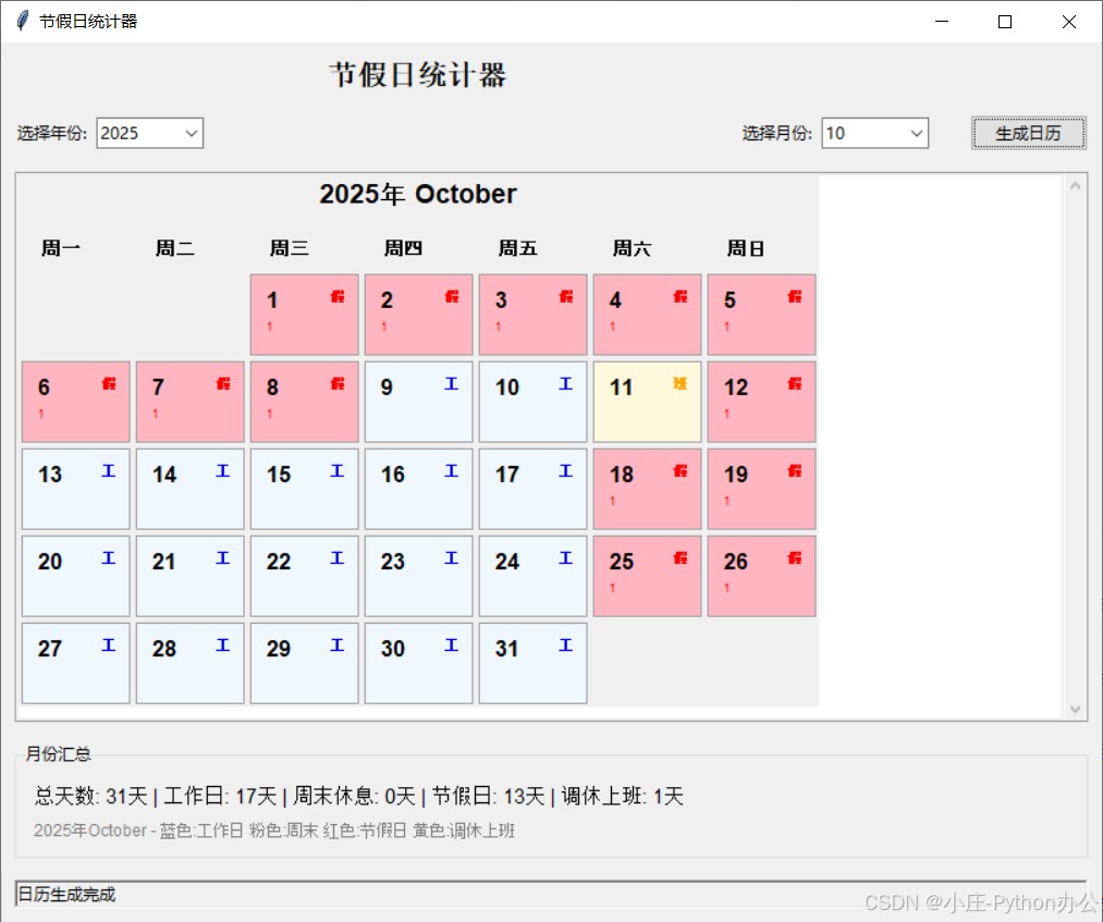 chinese_calendar确保节假日信息准确 - 用户友好的界面:直观的颜色编码和清晰的统计信息
