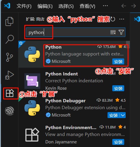 2.安装Python插件,点击扩展,在搜索框中输入“python”,点击“Install”安装